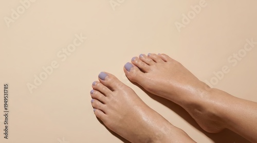 Half-Moon Lavender Bliss color perfect pedicure on feet. Female feet on soft beige studio background with copy space, beauty concept, nail salon.