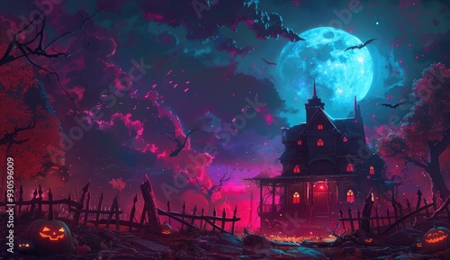 Halloween Background: Haunted House with Glowing Lanterns, Eerie Trees, and Scattered Pumpkins Under Full Moon