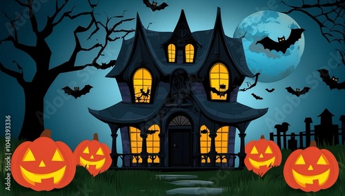 halloween, moon, pumpkin, house, night, bat, autumn, castle, holiday, silhouette, vector, haunted, tree, horror, skittish, illustration, dark, scarey, bat, celebration, cartoon, october, design, cemetery, black