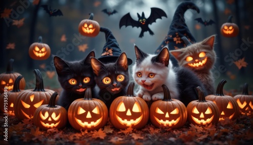 Halloween banner featuring a cute blak cats Halloween attributes, small pumpkins on orange and black background