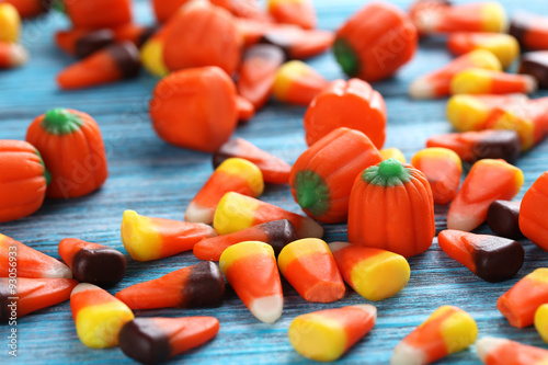 Halloween candy corns on blue wooden background