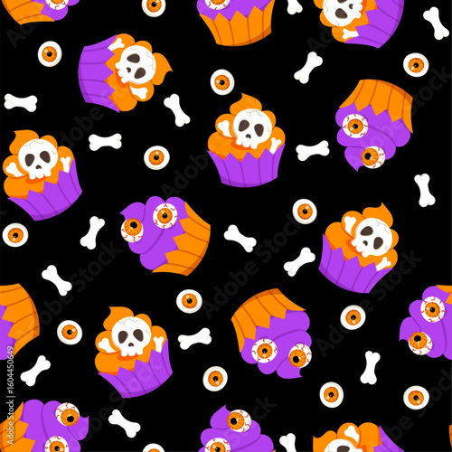 Halloween cupcakes seamless pattern. Vector Halloween repeat print with cute little cake, skulls, bones and zombie eyes on black background. Funny dark texture for fabric, decoration, wrap, backdrop