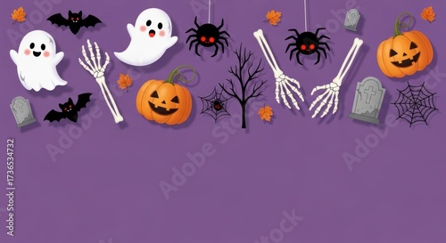 Halloween decorations featuring pumpkins ghosts bats spiders on purple background