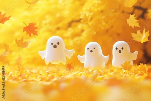 Halloween festival without text on Yellow and Black: A playful color combination featuring cute ghosts and falling autumn leaves., 3D shapes, octane render, high