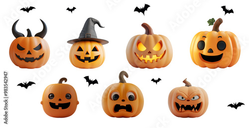 Halloween pumpkin set with jack-o’-lantern faces: angry, happy, funny in close-up, half-body, and full-body in 3D cartoon, Isolated on Transparent Background, PNG