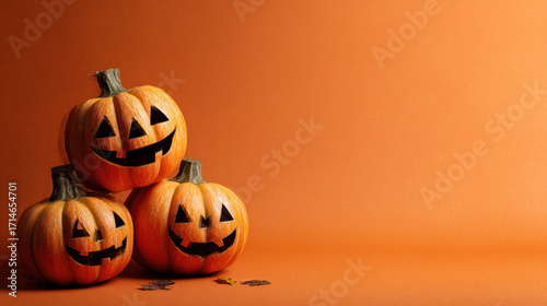 Halloween pumpkins carved into Jack-o'-lantern decorations on an orange backdrop with copy space