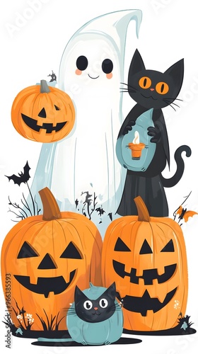 halloween, pumpkin, hat, cat, holiday, orange, sorcerer, black, autumn, vector, illustration, cartoon, scarey, lantern, october, isolated, celebration, skittish, horror, ghost, face, white, smile, vegetable, jack