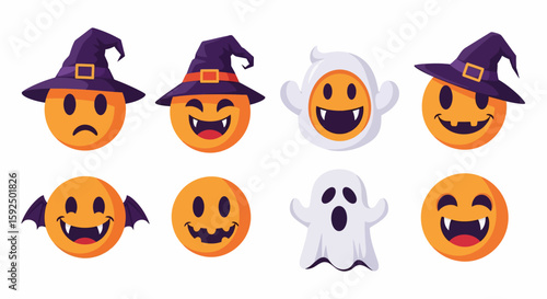 halloween, emoticon, face, sorcerer, hat, ghost, bat, costume, skittish, scarey, orange, smile, expression, happy, sad, teeth, wing, purple, white, cartoon, illustration, design, vector, graphic, character, fun, holiday, celebration, october, festive, grinning, evil, vampire, cute, cheerful, playful, digital, art, icon, symbol, set, collection, element, isolated, drawing, clip art, funny, emotion