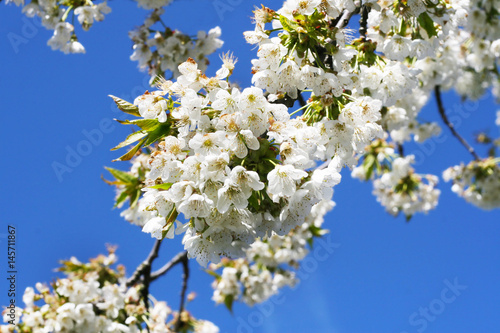 Hanami - Weiße Blüten der Süßkirsche im Mai bei strahlendem Sonnenschein, endlich Frühling