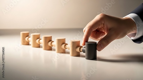 Hand choosing a different mug in a row of identical mugs in soft minimalist lighting on a white surface for leadership