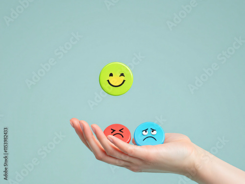 Hand choosing between happy, neutral, and sad faces on colored circles.