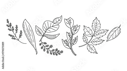 Hand drawn botanical leaf illustration set in vintage line art style for eco, natural, and decorative projects
