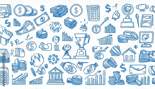 Hand drawn business icon set. Finance, money, investment icon sketch doodle blue pen stroke style. Business success, winner, finance element. perfect any project.