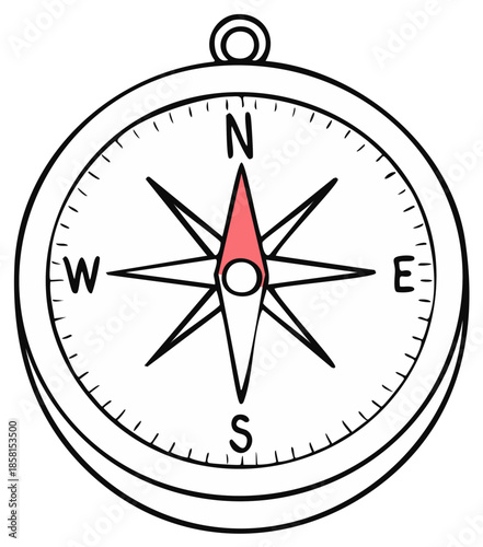 compass, navigation, orientation, direction, travel, guide, map, north, south, east, west, cardinal, rose, windrose, tool, instrument, drawing, vignetting, hand-drawn, hand-made, graphic, illustration, cartography, orienteering, adventure, exploration, discovery, journey, outline, isolated, white, red, pointer, symbol, design, signs, find, finding, wanderlust, location