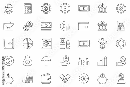 finance, investment, icon, hand-drawn, vignetting, doodle, money, banking, business, financial, currency, dollar, coin, cash, calculating machine, bank, briefcase, credit card, safe, pie chart, coin, stack, umbrella, protection, hand, graph, money box, billfold, handshake, target, saving, accounting, asset, budget, capital, commerce, economy, fund, income, loan, market, payment, portfolio, wealth, line art, vector
