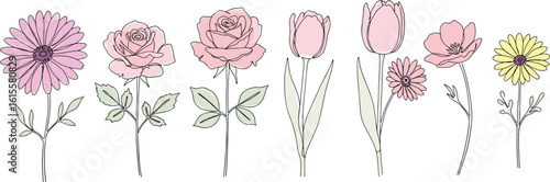 Hand drawn flower set illustration, pink roses, tulips, daisies, poppies, botanical design, vintage floral sketch art, elegant spring decor