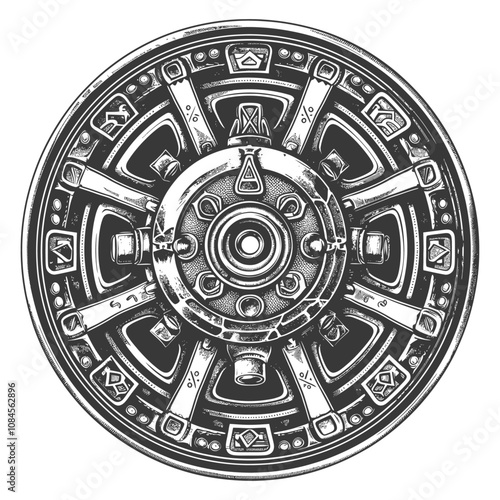 circular, mechanical, object, illustration, intricate, detail, design, pattern, graphic, black, white, art, abstract, geometric, symmetric, vintage, retro, futuristic, technology, engine, machinery, wheel, hub, gear, spoke
