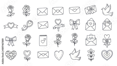 Hand Drawn Valentine Icons: Hearts, Roses, Envelopes, Doves, Bows - Sketchy Style