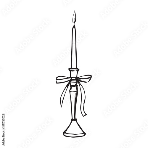 Hand drawn vintage candlestick with a burning candle and ribbon bow, black whimsical line art illustration isolated on white background, perfect for romantic, wedding and cozy decor designs.