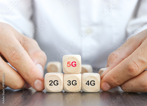 hand hold ing a wooden cube 5G network (5th generation) connects the technology of the future around the world. Wooden cubes switched to 5G