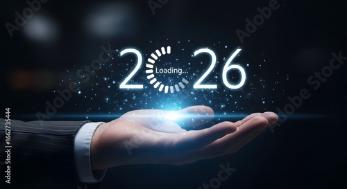 2026, loading, future, technology, hand, progress, business, concept, anticipation, new, year, digital, development, planning, growth, success, innovation, time, abstract, graphic, illustration, design, symbol, corporate, modern, light, futuristic, bright, glow, network, connection, datum, communication, information, optimistic, vision, idea, start, beginning, transformation, dark, background, suit, man, person, white, blue, sparkle, energy