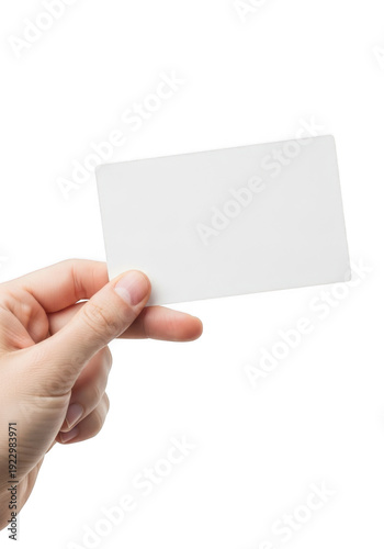 Hand holding a blank white business card isolated on transparent background