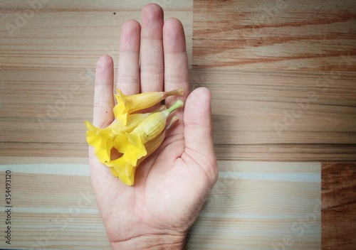 hand holding a bunch of yellow oleander flowers on wooden background with copy space for text , herbal medicinal concept, Ayurveda