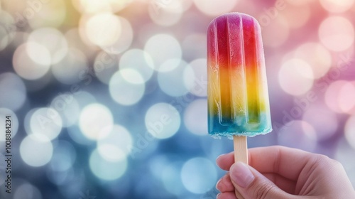 Hand Holding a Colorful Ice Cream Popsicle with a Bokeh Background.