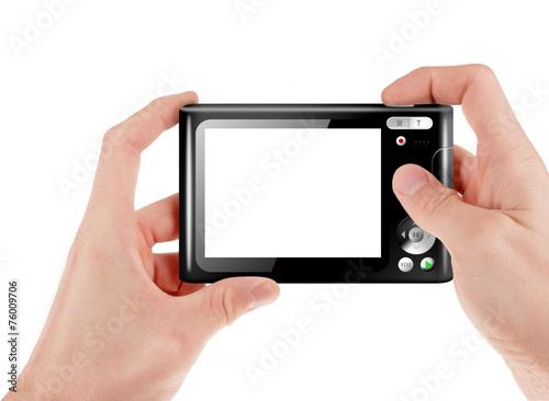 Hand holding a compact digital camera with empty LCD screen