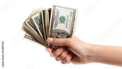 hand, money, dollar, cash, banknote, american, currency, wealth, financial, business, finance, investment, economy, profit, income, payment, transaction, exchange, purchase, sale, giving, receiving, holding, stack, fan, bill, paper, green, grey, image, closeup, light, background, black, white, neutral, isolated, close, hand-held, fanned, widener, united, state, note, value, worth, earned