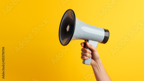 Hand holding a megaphone, wearing a blue suit on a vibrant yellow background