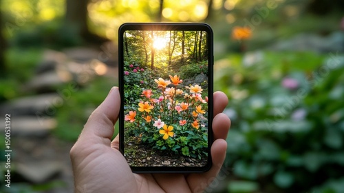 smartphone, hand, flower, garden, nature, sunlight, tree, path, vibrant, colourful, blossom, foliage, outdoors, photo, image, screen, display, capture, mobile, technology, view, beauty, spring, summer, detail, sharpened, bright, fresh, picnic, blossom, closeup, photo, digital, viewfinder, bloom, lush, green, scenic