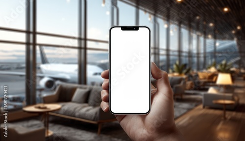 hand, smartphone, screen, blank, aerodrome, lounge, modern, travel, aeroplane, window, view, interior, blurred, background, light, cosy, comfort, technology, display, empty, sharpened, image, realistic, digital, contemporary, design, photorealistic, lighting, calm, neutral, smooth, surface, holding, device, traveler, waiting, passenger, casual attire, ambience, business, horizon, white, grey, beige, wooden, furniture, chair