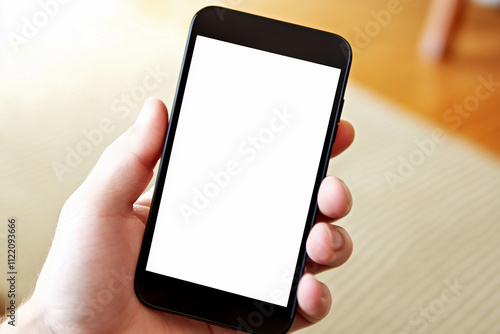 Hand holding a smartphone with blank screen indoors