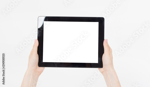 Hand holding black tablet isolated on white clipping path inside. Top view.Mock up.Copy space.Template.Blank.