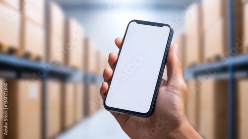 Hand holding blank phone screen in warehouse, technology meets logistics