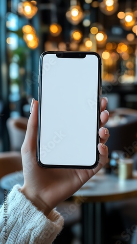 phone, smartphone, screen, blank, display, mobile, hand, holding, template, technology, digital, device, contraption, wireless, communication, cyberspace, connection, app, application, website, design, modern, elegant, clean, simple, background, cafes, eatery, bokeh, light, blurred, indoor, person, woman, finger, touch, showing, presenting, image, illustration, concept, idea, marketing, advertising