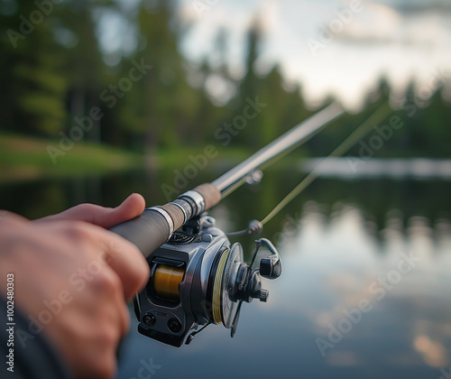 Hand Holding Fishing Rod by the River - Nature and Relaxation Concept