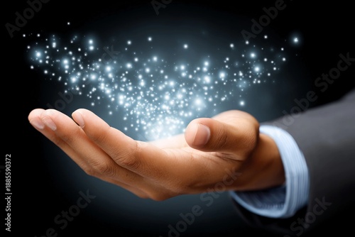 Hand holding magic sparkles in dark background