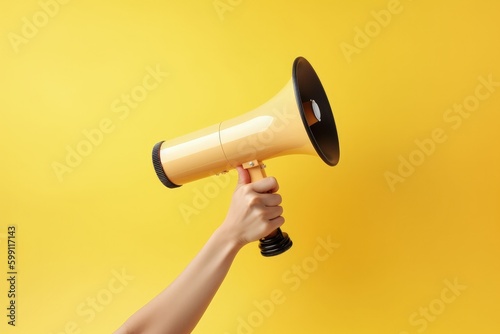 Hand holding megaphone on yellow background, ads and sales concept. Generative AI