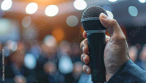 Hand Holding Microphone at Conference: A close-up shot of a hand confidently gripping a microphone during a large conference or presentation. The blurry background emphasizes the speaker's prominence.