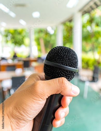 hand, microphone, black, outdoors, blurred, sharpened, speaker, talking, event, speech, conference, presentation, meeting, public, voice, audio, communication, technology, person, detail, closeup, soft, light, green, tree, building