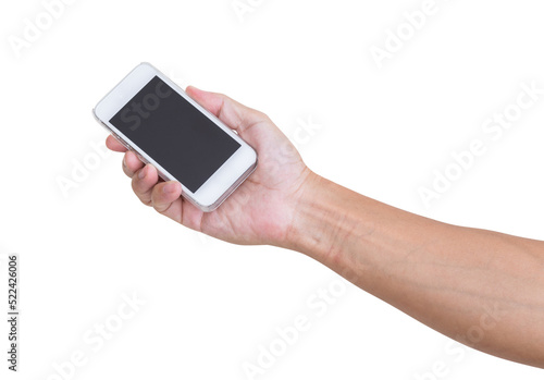 Hand holding mobile phone isolated
