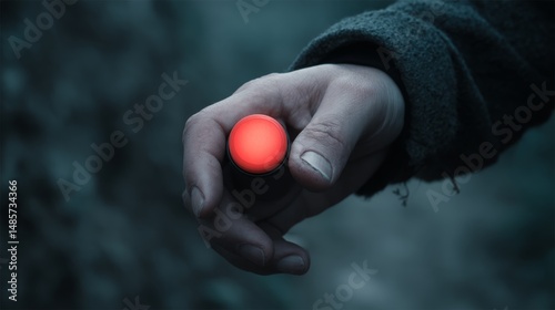 Hand Holding Red Button with Glowing Light in Dark Environment Showcasing Control and Technology Concept