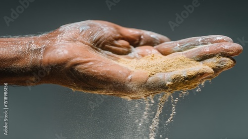 hand, sand, water, earth, texture, closeup, studio shot, isolated, white background, grain, dirtied, dust, particle, flow, dripping, cinematic, shadow, realistic, detail, nature, element, human, skin, arm, brown, beige, photo, image, background