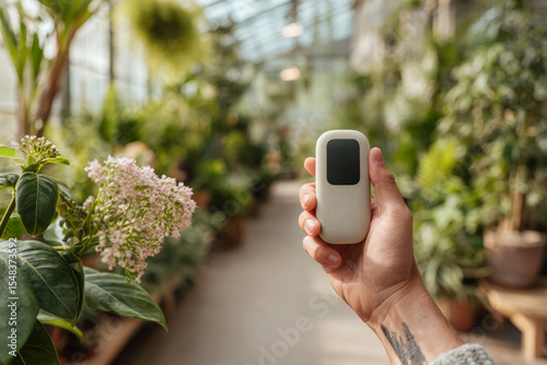Hand holding smart AI assistant device in indoor greenhouse with houseplants
