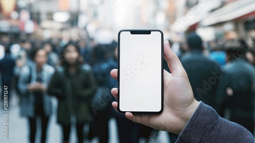 hand holding smart phone with blank white screen. Background blurred city street. crowded scene.