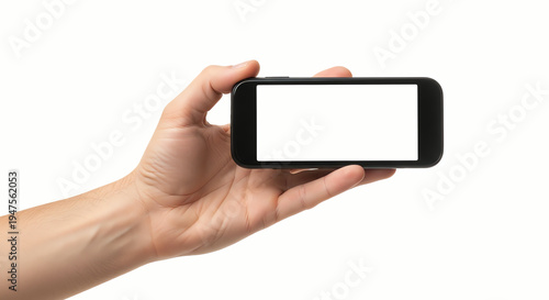 Hand holding smartphone horizontally with blank screen on white background