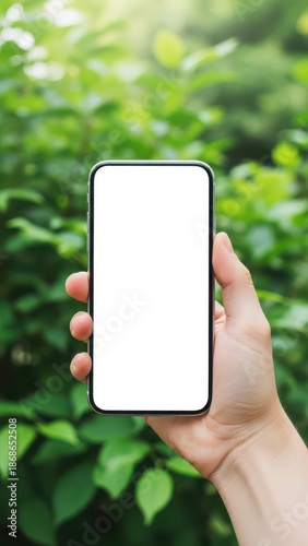 hand, smartphone, phone, screen, blank, forest, green, foliage, nature, leaf, technology, digital, device, background, vibrant, lush, modern, contraption