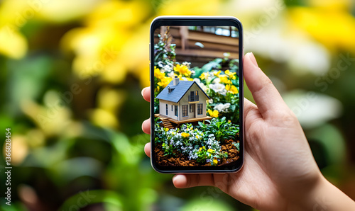 house, model, smartphone, photo, real, estate, home, flower, garden, hand, closeup, technology, mobile, picture, display, screen, miniature, building, yellow, green, white, plant, nature, spring, summer, bright, colours, housing, property, dream, new, residential, architecture, design, lifestyle, scene, view, digital, holding, small, cute, detailed, floral, vibrant